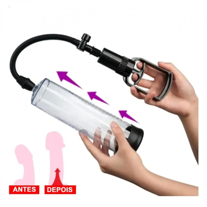 - Com medidor de Pressão, com gatilho Manual. 3 Anéis de silicone e um com formato de vagina.