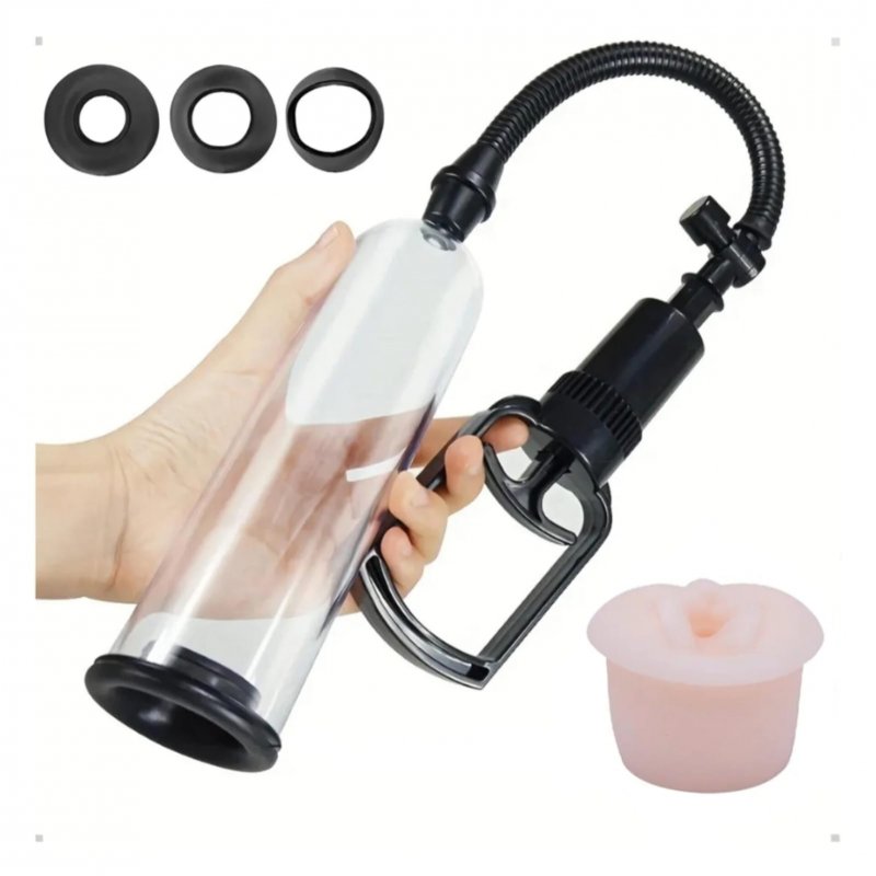 Bomba Peniana Manual Alavanca Desenvolvimento Peniano com 3 Anéis e 1 em Formato de Vagina