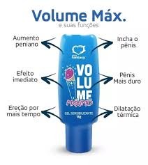 O Volume Máximo é um gel sensibilizante que aumenta a sensibilidade e a excitação do homem, possui ação vasodilatadora que dá a sensação de inchaço no pênis e aumentando o enrijecimento. Ele possui Extrato de Damiana que é um estimulante sexual afrodisíaco, e extrato de ginseng que ajuda a aumentar a potência proporcionando mais vitalidade durante o ato sexual.