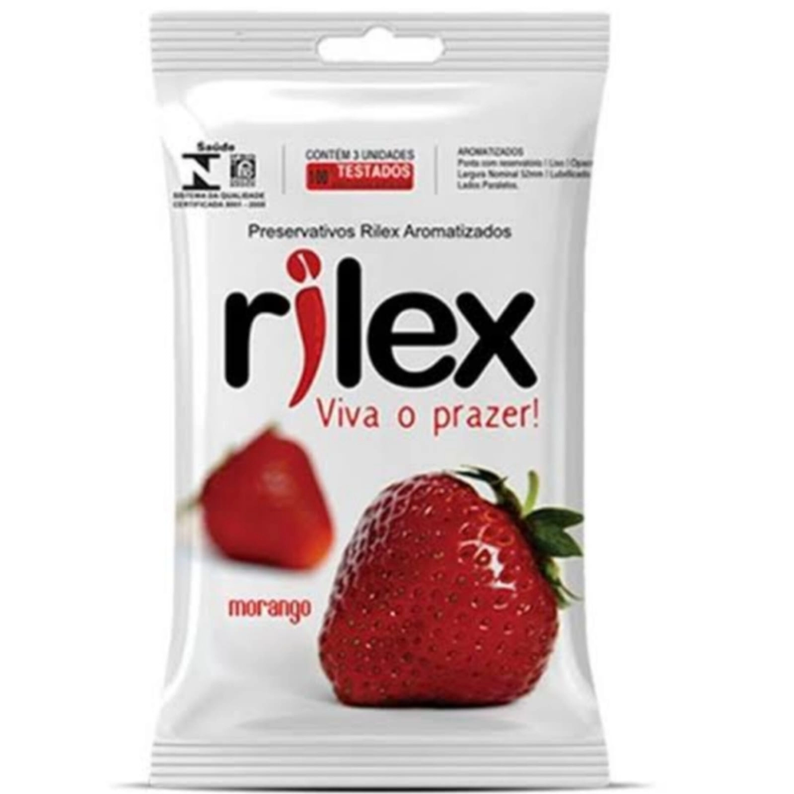 Látex de borracha natural, óleo de silicone (lubrificante) e aroma artificial de morango.