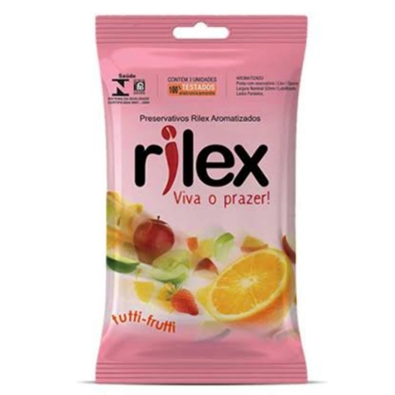Látex de borracha natural, óleo de silicone (lubrificante) e aroma artificial de Tutti Frutti.